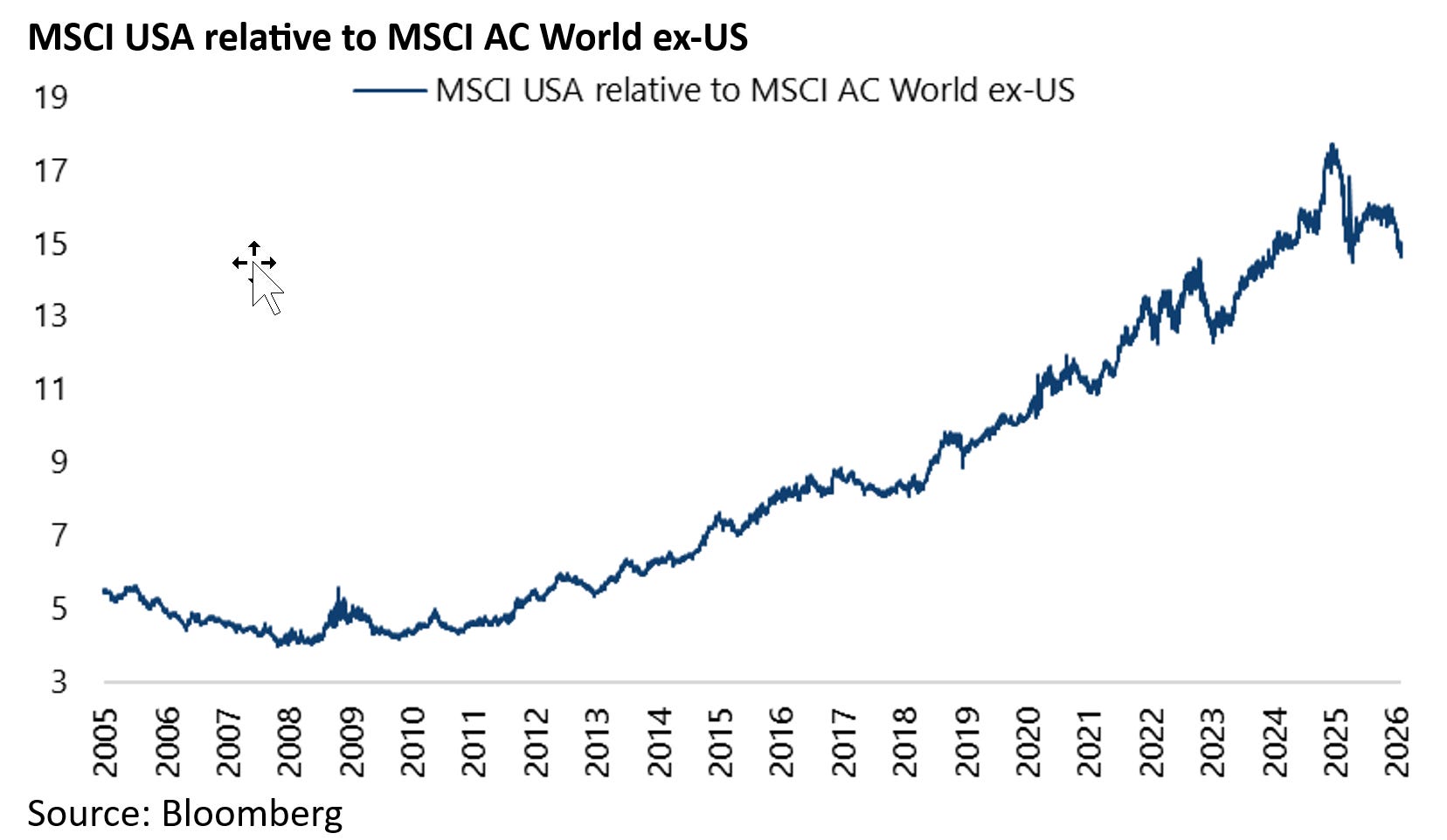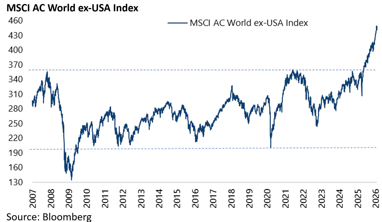 Meanwhile the MSCI AC World ex-US Index broke out of a 18-year trading range last year supporting such a view.