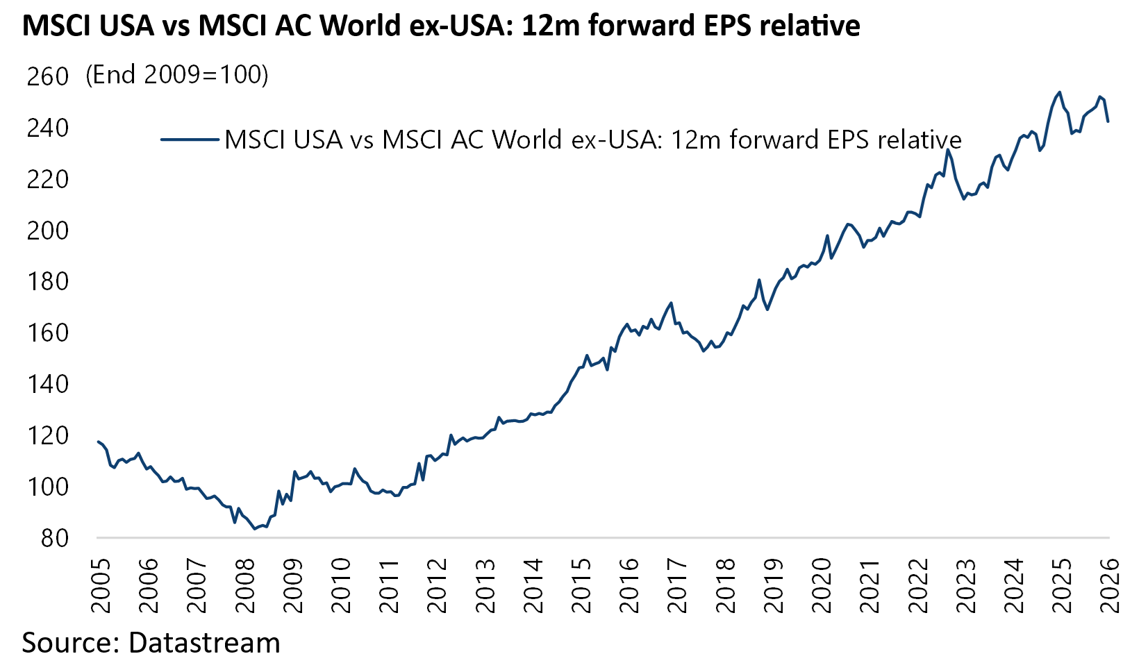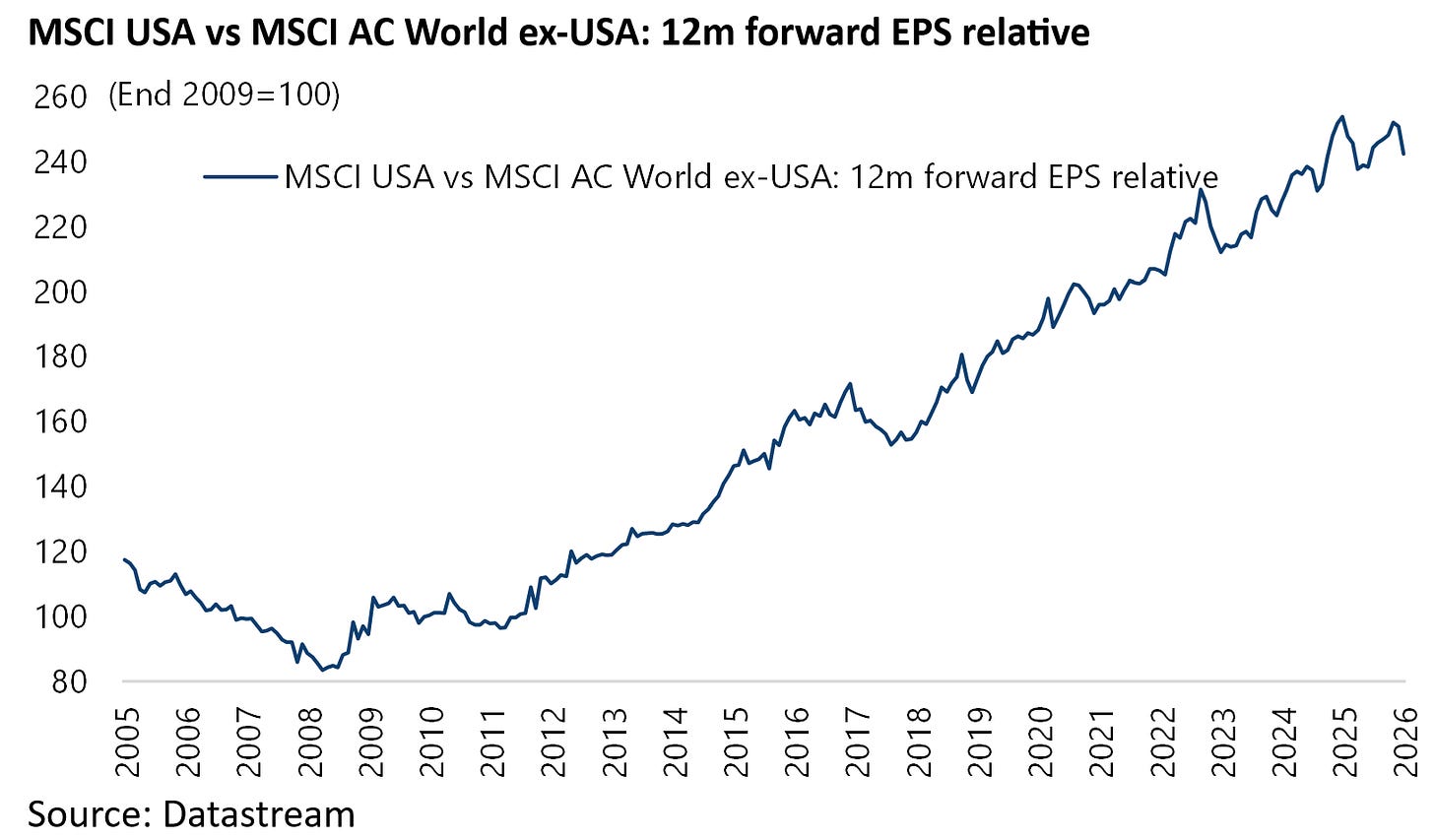 Thus, the 2025 and 2026 consensus earnings growth forecasts for MSCI USA are now 14.1% and 15.4% respectively, compared with 6.7% and 15.0% for MSCI AC World ex-US.