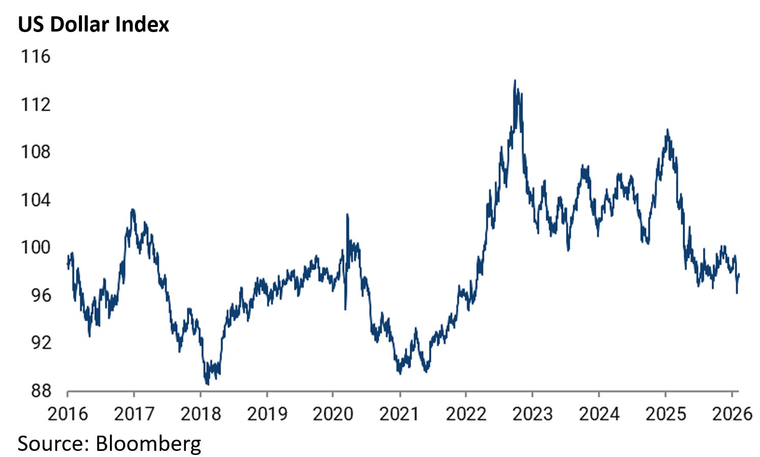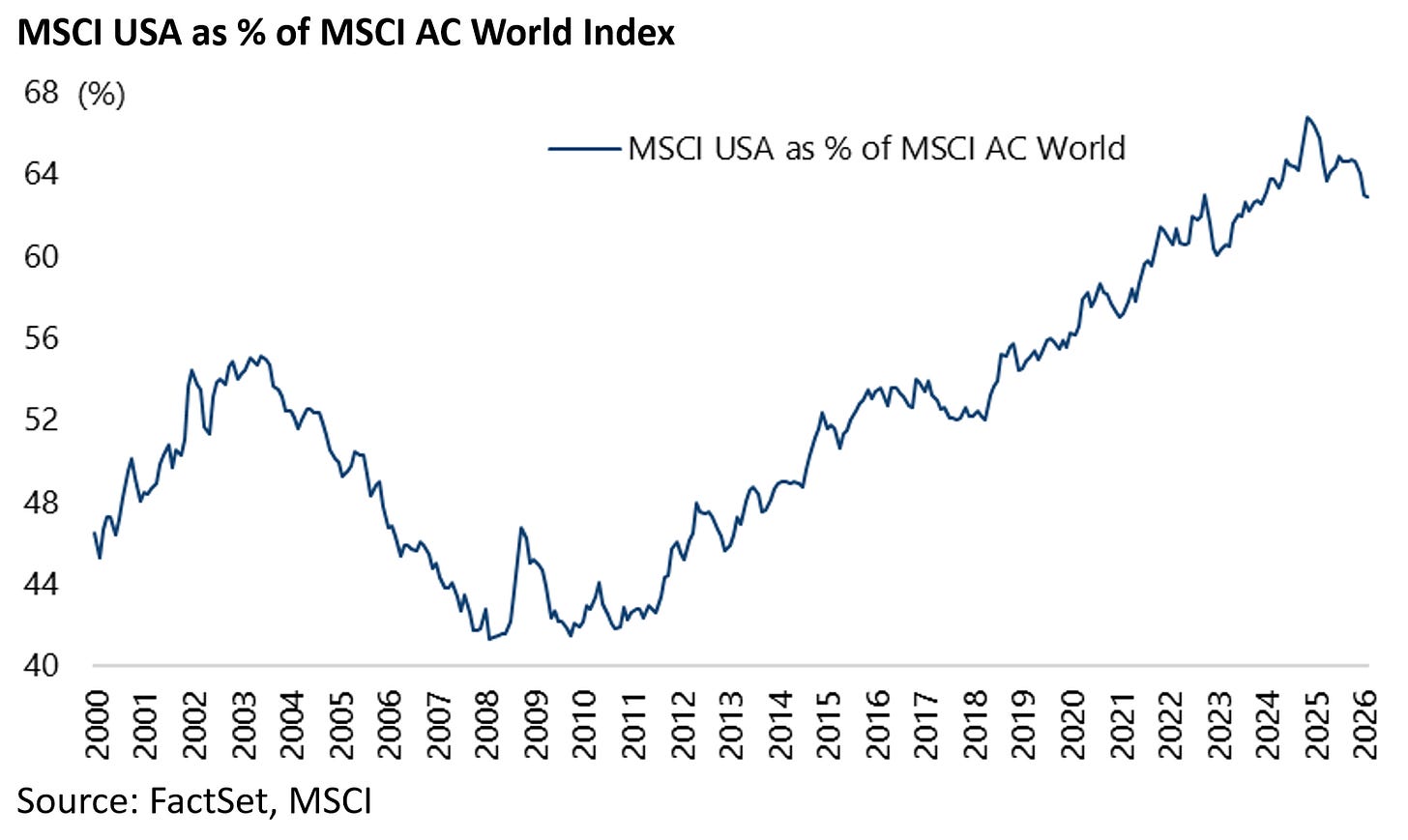 Also, as a result of this multiple expansion in the stock markets outside the US as well as the 10% decline in the US dollar index since the start of last year, it remains the case that America’s share of MSCI AC World Index peaked on 24 December 2024.