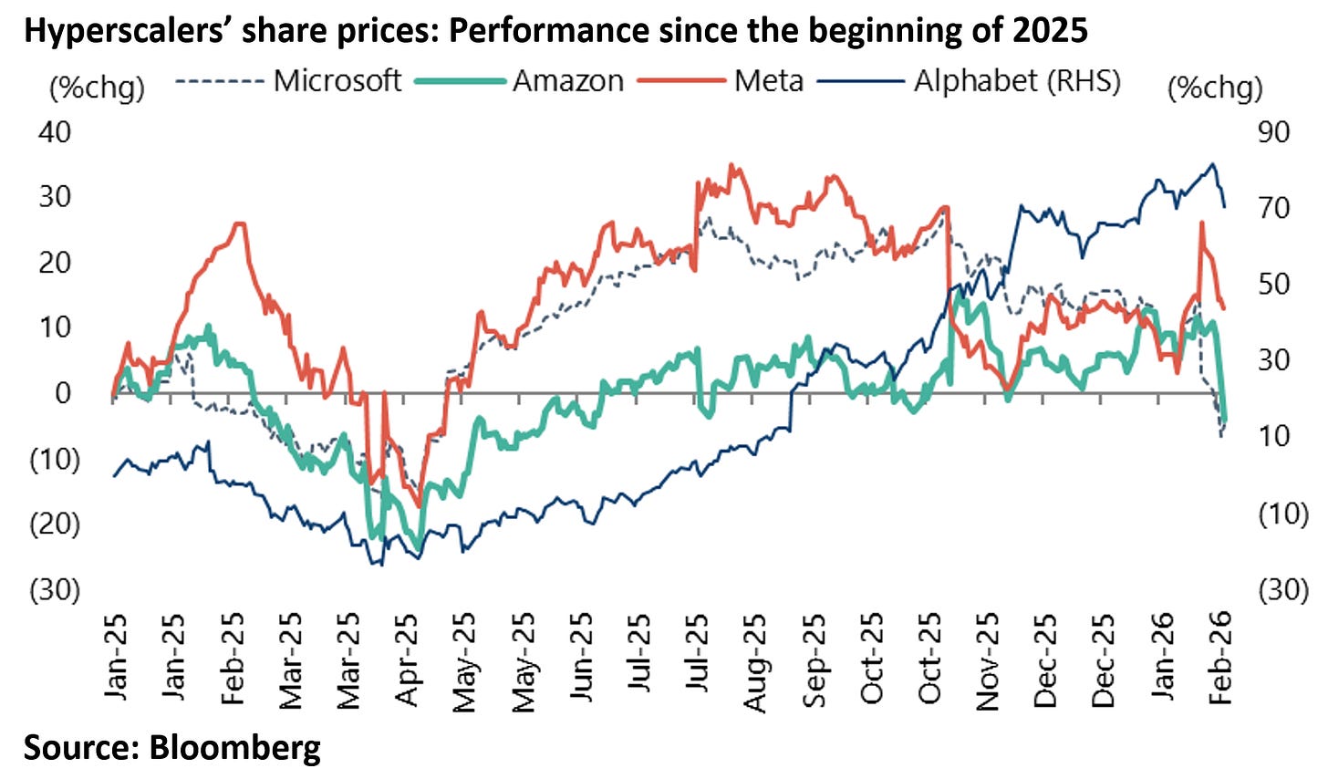 Thus, Alphabet has doubled its capex guidance for 2026 to US$175-185bn, up from US$91bn in 2025, while Meta expects capex to total US$115-135bn in 2026, up from US$72bn in 2025.