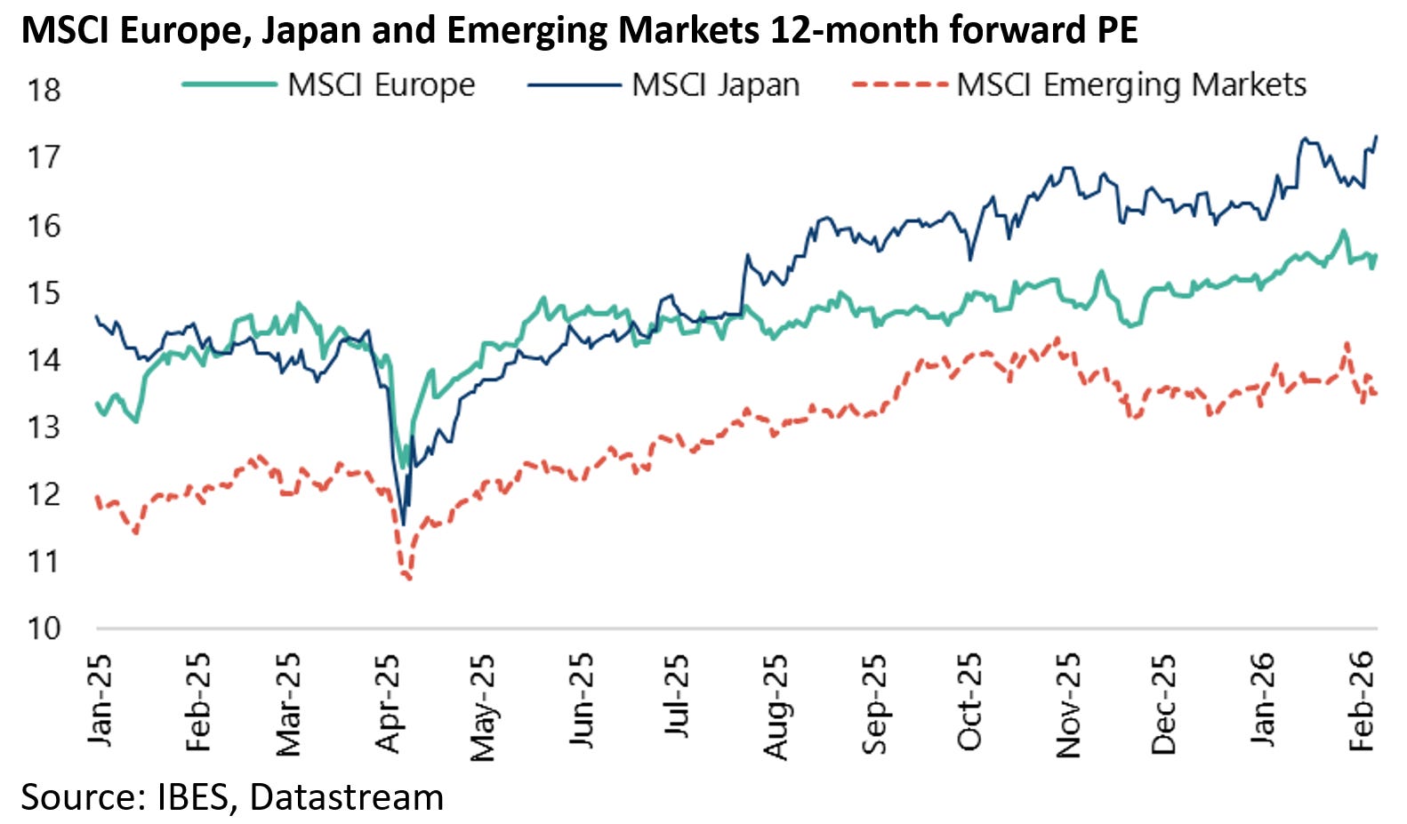 The MSCI Europe, Japan and Emerging Markets 12-month forward PE ratios have increased by 16%, 18% and 13% respectively since the beginning of 2025 to 15.6x, 17.3x and 13.5x, up from 13.4x, 14.7x and 12x at the end of 2024.