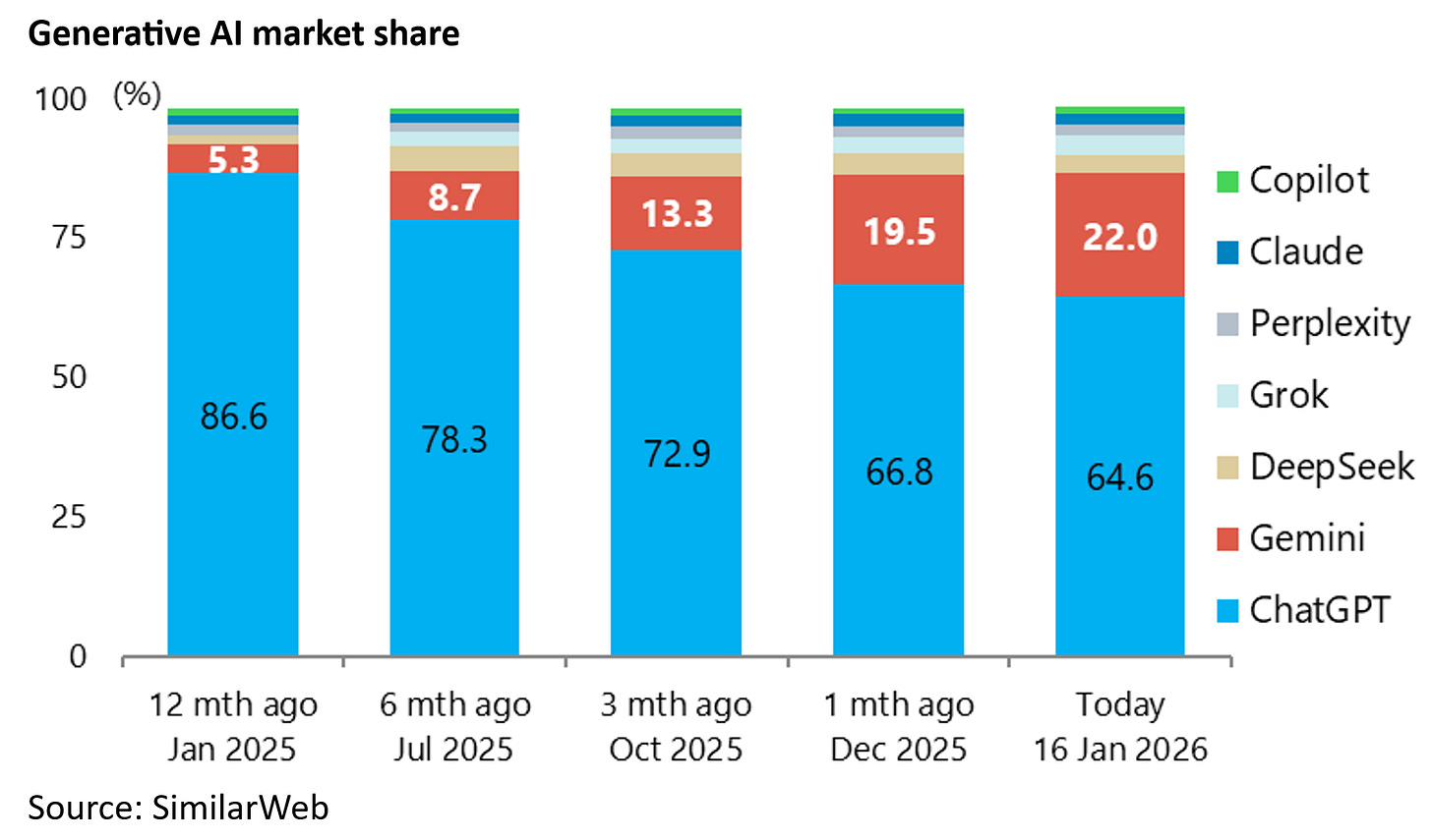 Still, the latest data shows Gemini taking market share from Open AI’s ChatGPT. Gemini’s web traffic share in the Generative AI market has increased from 5.3% to 22% over the past 12 months as of 16 January, while ChatGPT’s market share has declined from 86.6% to 64.6% over the same period, according to SimilarWeb.