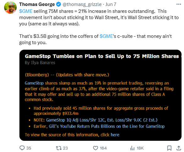We initially viewed the GME 75 million ATM share sale as a classic Wall Street play to fill the coffers of the c-suite at cost of shareholders (20% dilution in this case). Analyzing the company further, we stand corrected - Ryan Cohen is a legit CEO of the shareholders.