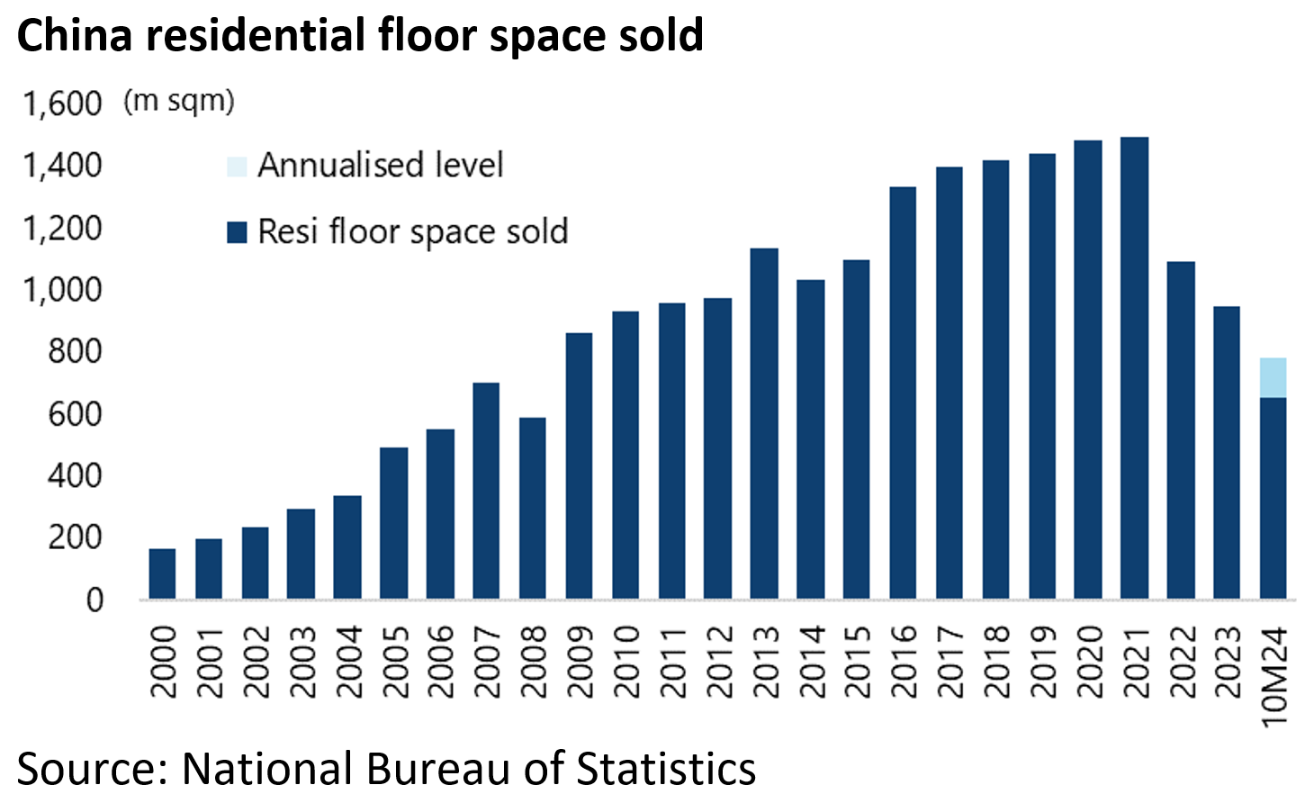 Still the recent pickup in activity suggests that perceptions of the residential market have now changed given the positive signal given on property from the Politburo meeting on 26 September which, crucially, President Xi Jinping attended.