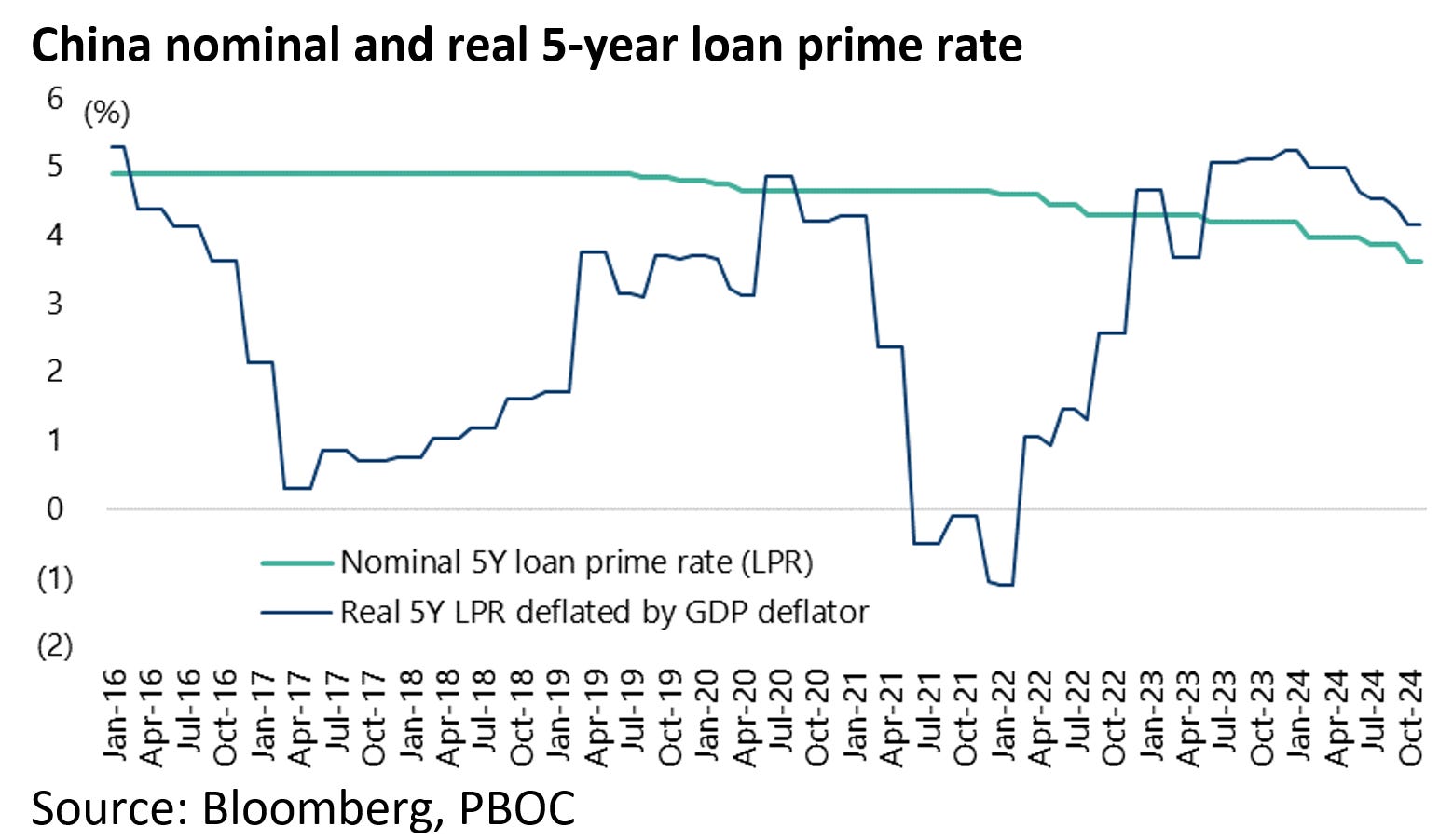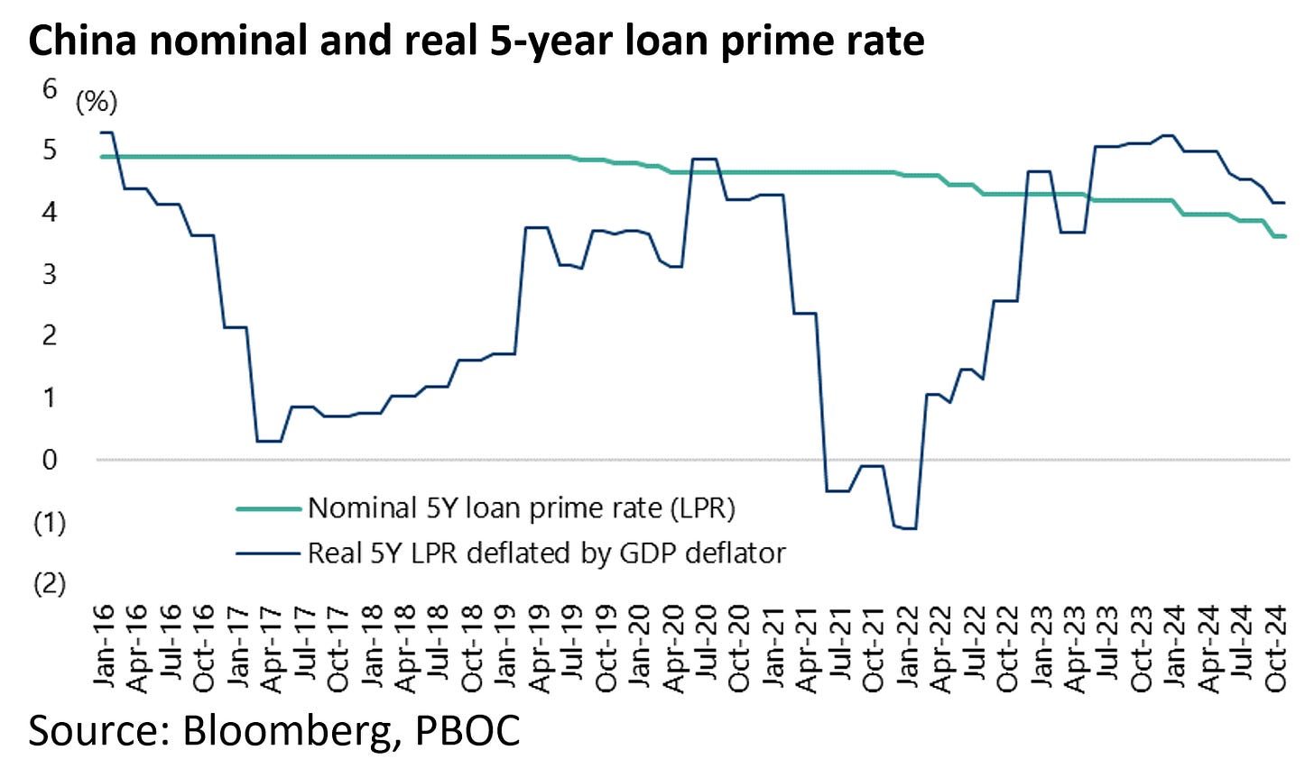 If the real five-year LPR, deflated by GDP deflator, is still a positive 4.1%, in nominal terms at least the rate has declined by 105bp since the start of 2022.