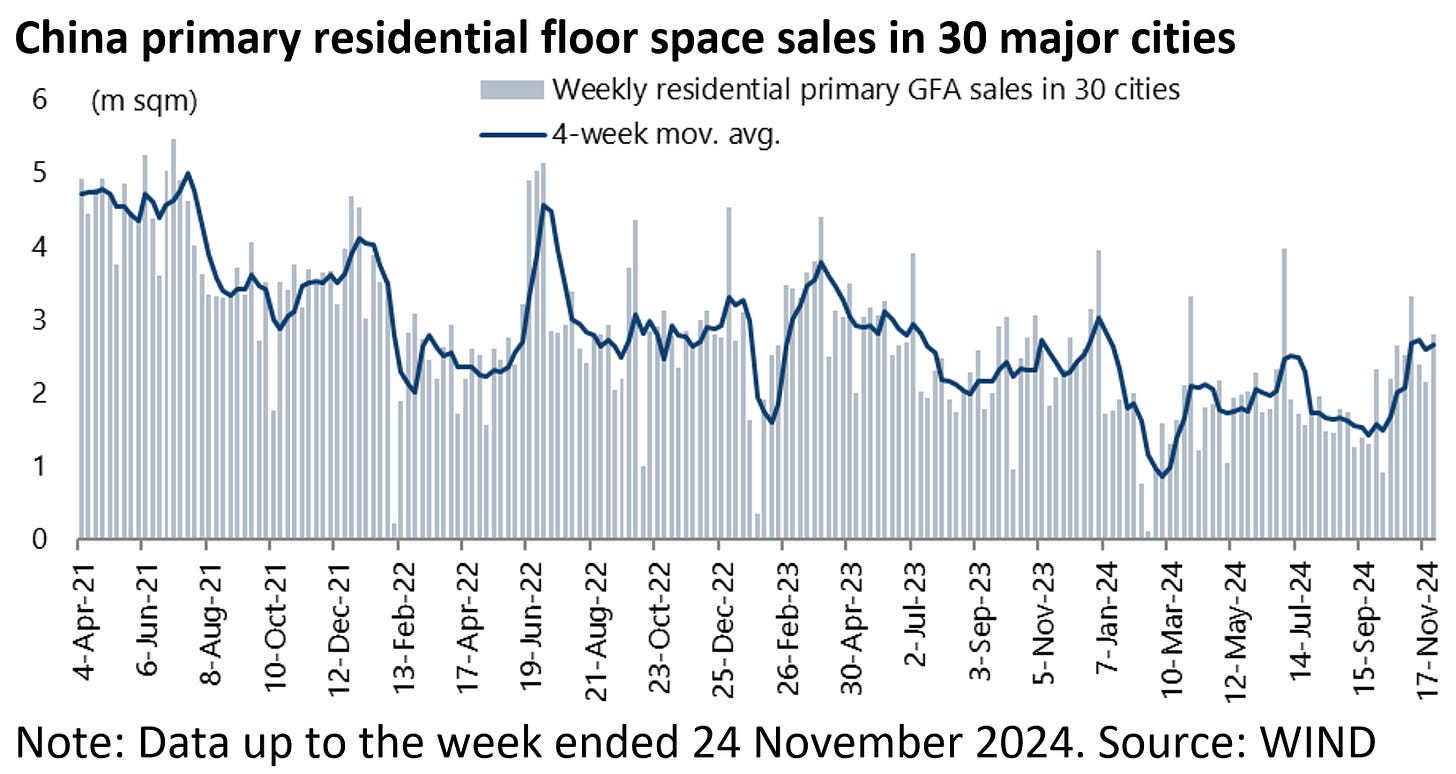Thus, primary residential floor space sales in 30 major cities rose by 19% YoY in the four weeks to 24 November but are still down 29% YoY year-to-date.