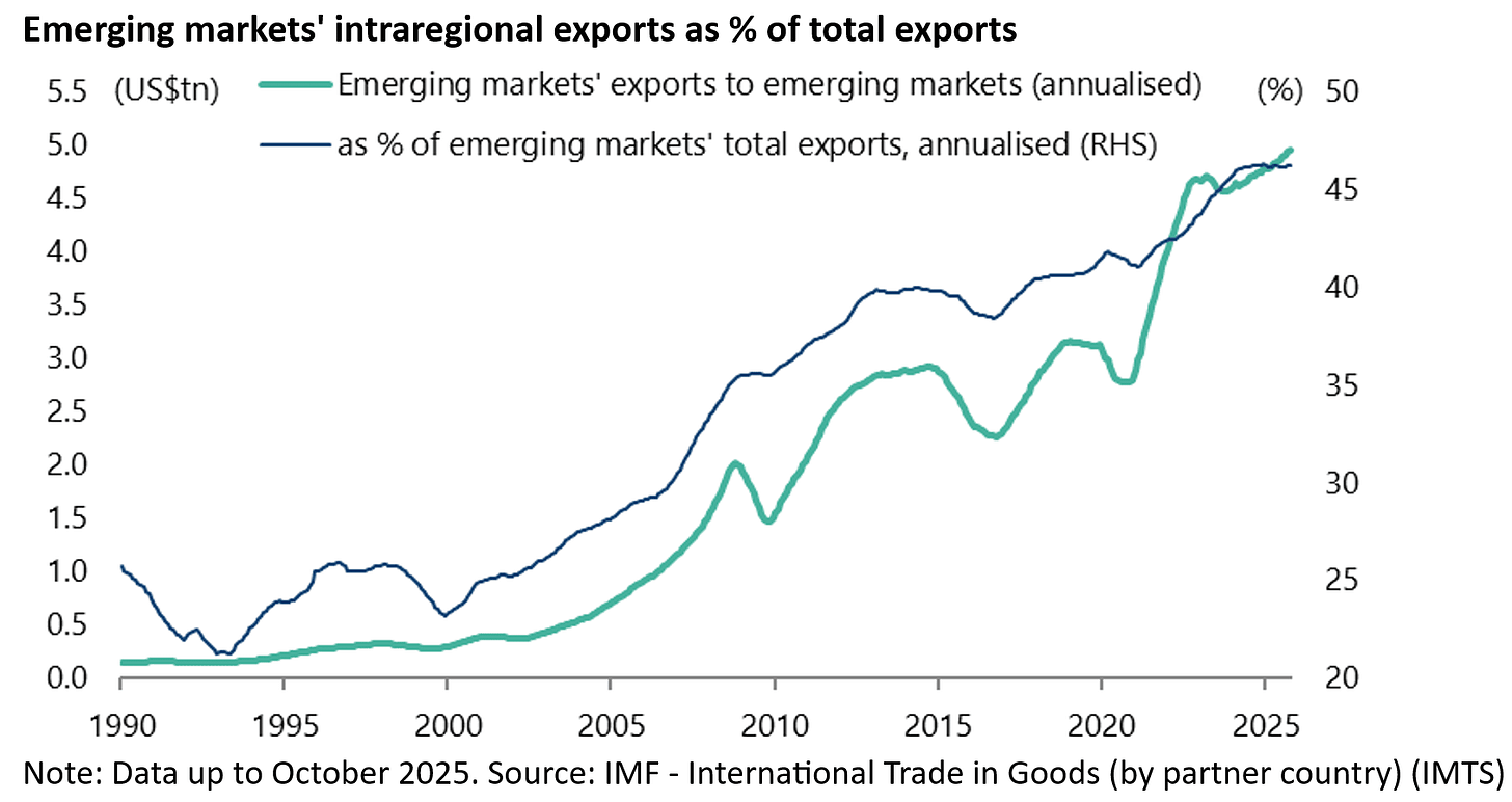 Emerging markets’ exports to other emerging markets rose to an annualised US$4.96tn in the 12 months to October 2025, accounting for 46.2% of emerging markets’ total exports, up from US$292bn or 23.2% of total exports in 1999.