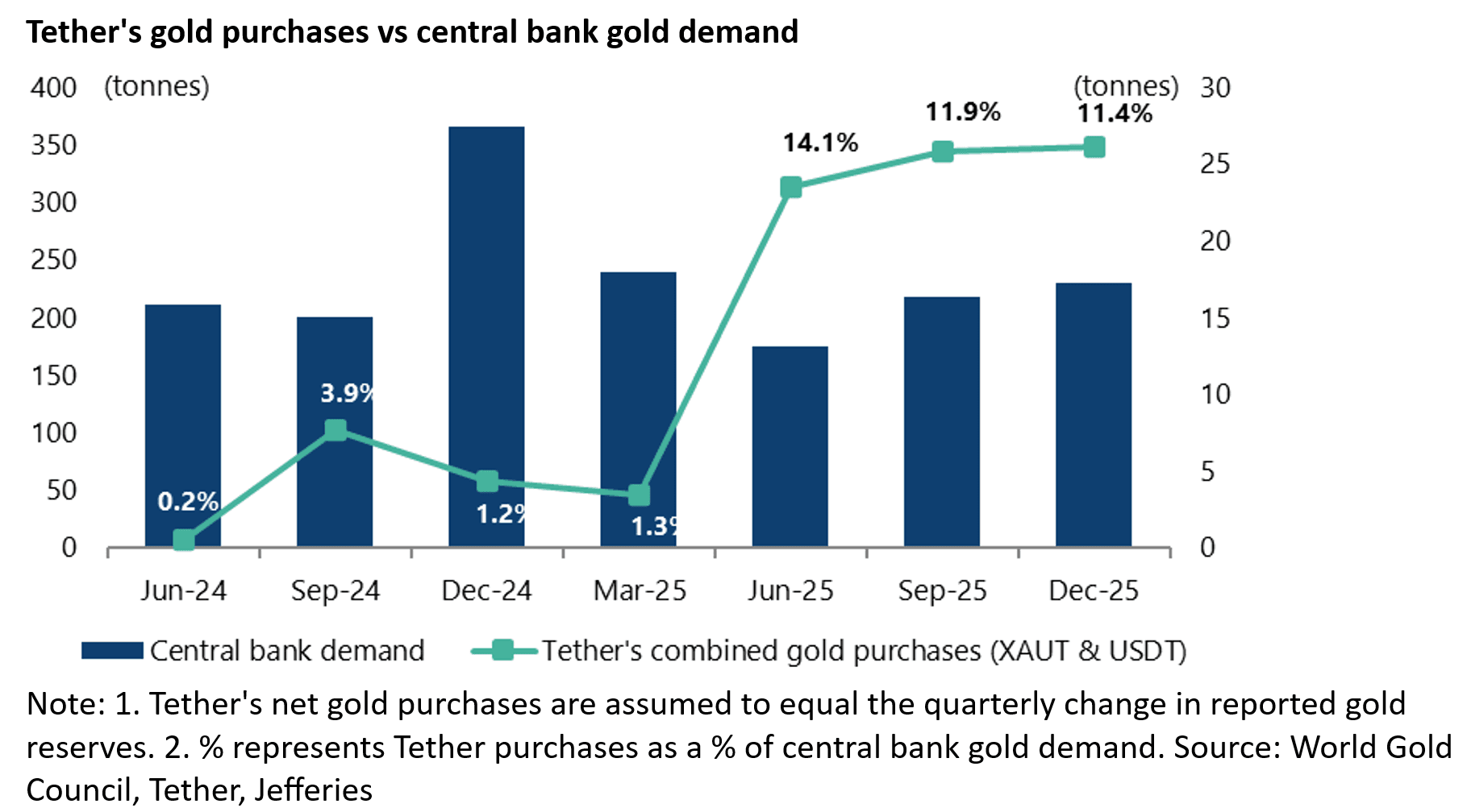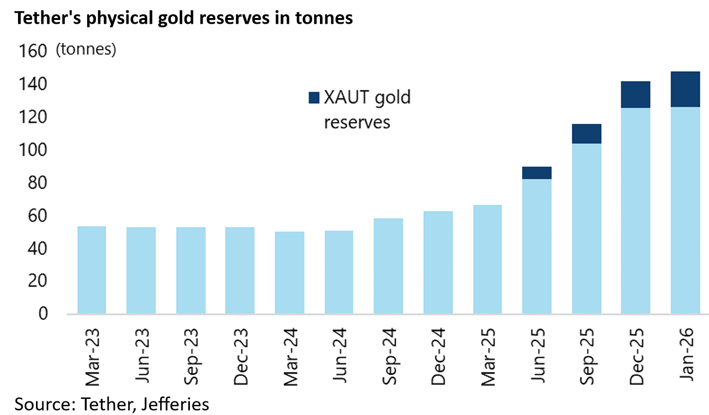 It is also the case that tether’s gold purchases of 26 tonnes in 4Q25 were equivalent to 11.4% of total central bank gold demand of 230 tonnes last quarter.