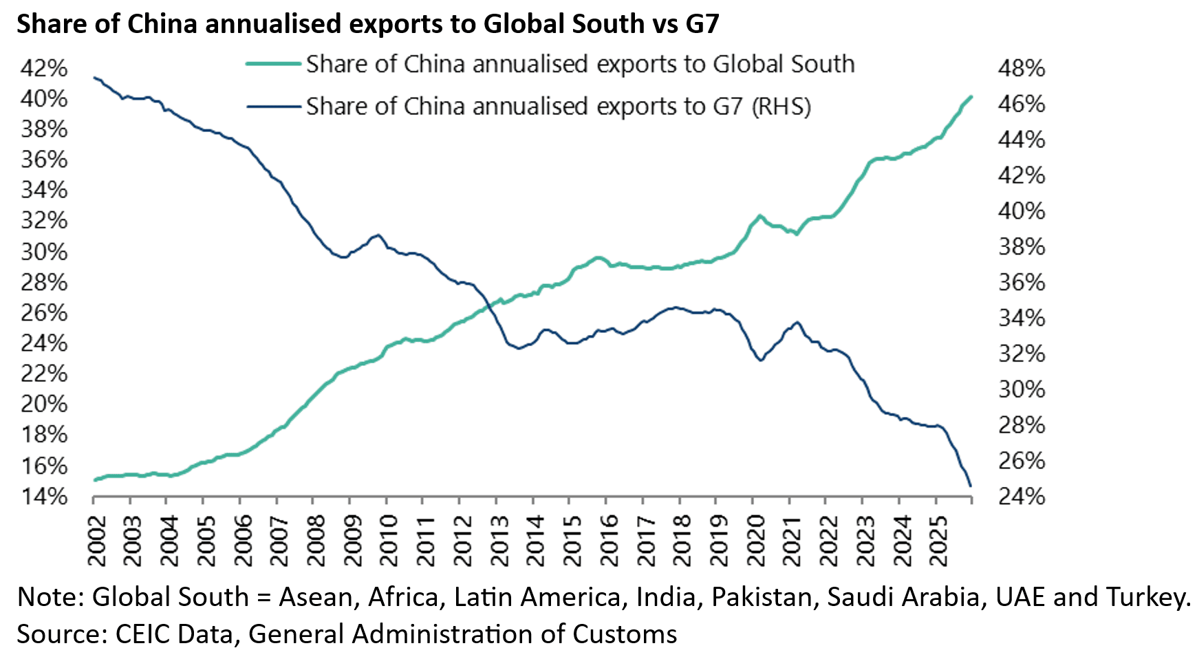 As a result, China’s exports to the Global South now amount to 40.1% of its annualised total exports, up from 21% at the beginning of 2008, while the share of exports to the G7 has declined from 39% to 24.6% over the same period.