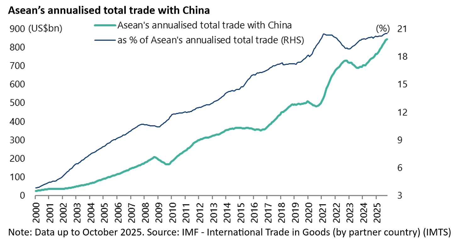 Similarly, Asean’s trade with China has risen from US$179bn or 11.6% of Asean’s total trade in 2009 to US$845bn or 20.5% of its total trade in the 12 months to October 2025.