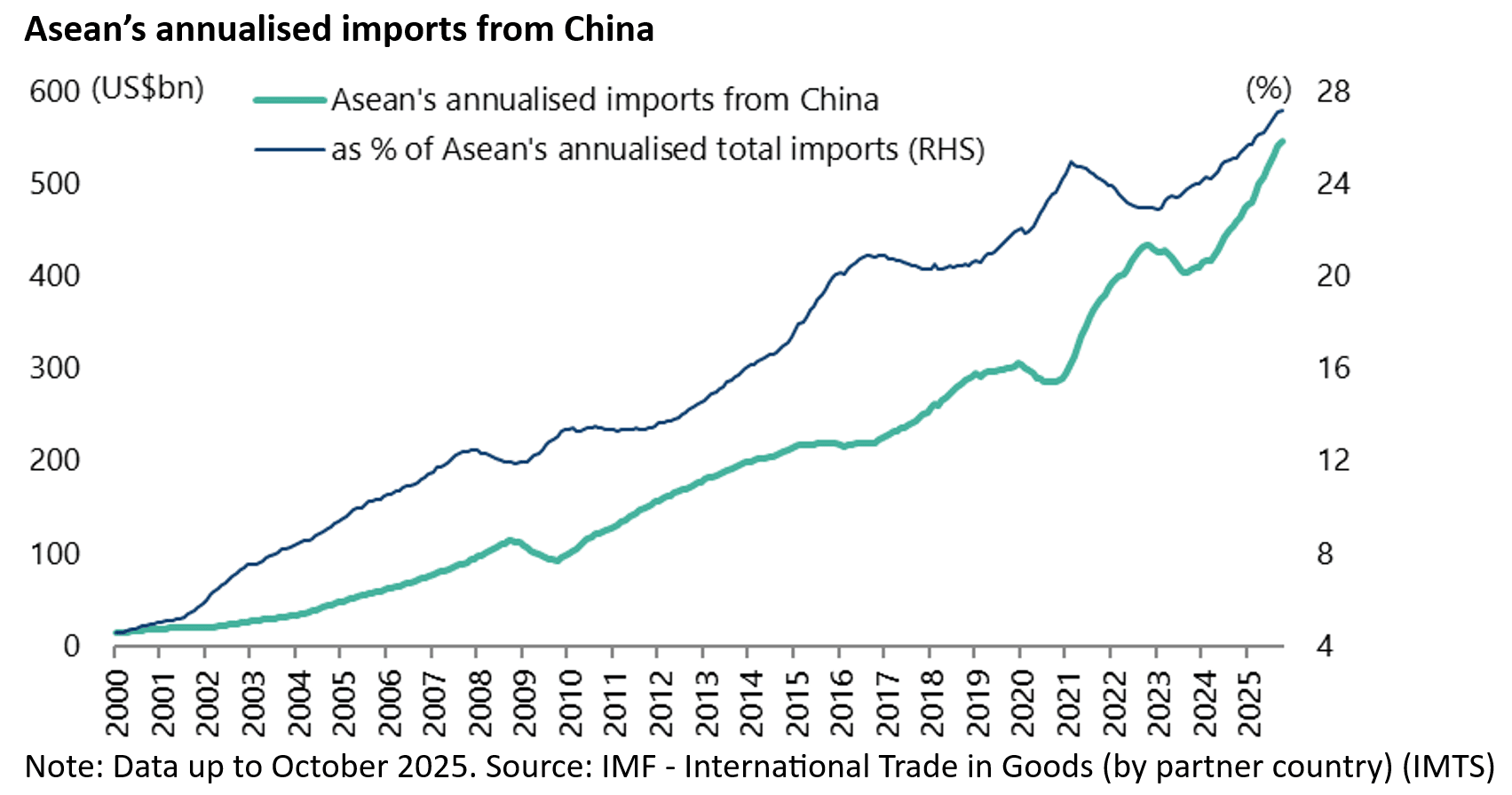 Asean’s imports from China have risen from US$97bn or 13.3% of total imports in 2009 to US$545bn or 27.1% of total imports in the 12 months to October.