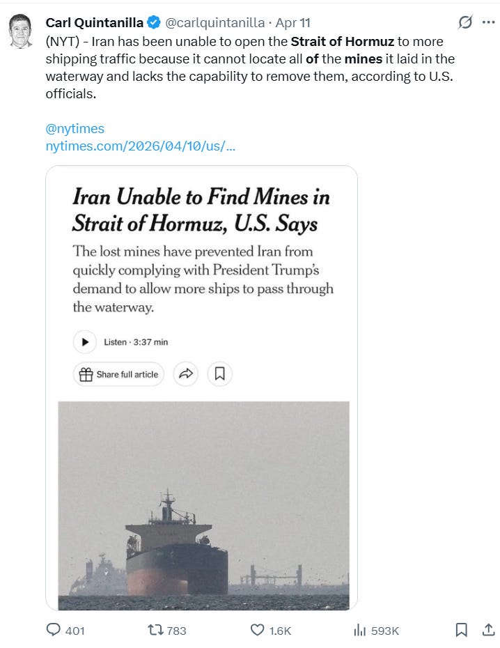 Second, the Strait is booby-trapped. A recent New York Times report highlights a technical nightmare: even if Iran wanted to open the lanes today, they’ve essentially booby-trapped the Strait with mines they don’t even know how to remove.