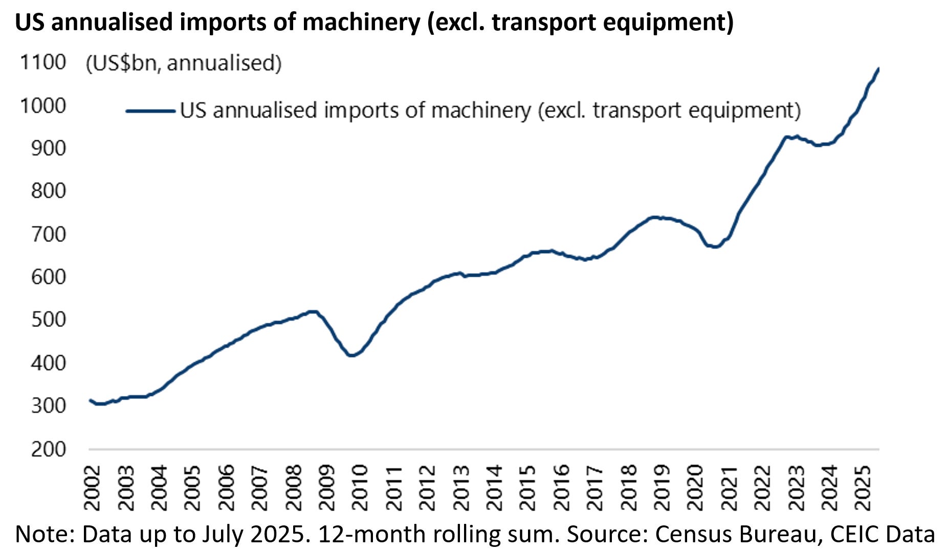 US imports of machinery, excluding transport equipment, have risen by “only” 31% from an annualised US$819bn in 2021 to US$1.086tn in the 12 months to July 2025.
