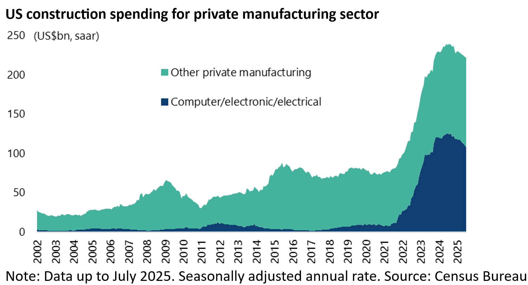 Thus, private construction spending for manufacturing facilities has more than doubled from a seasonally adjusted annual rate of US$98bn in January 2022 to US$239bn in June 2024 and US$222bn in July 2025, with construction spending for computer, electronic and electrical manufacturing up almost fivefold from a seasonally adjusted annual rate of US$26bn in January 2022 to US$126bn in July 2024 and US$108bn in July 2025.