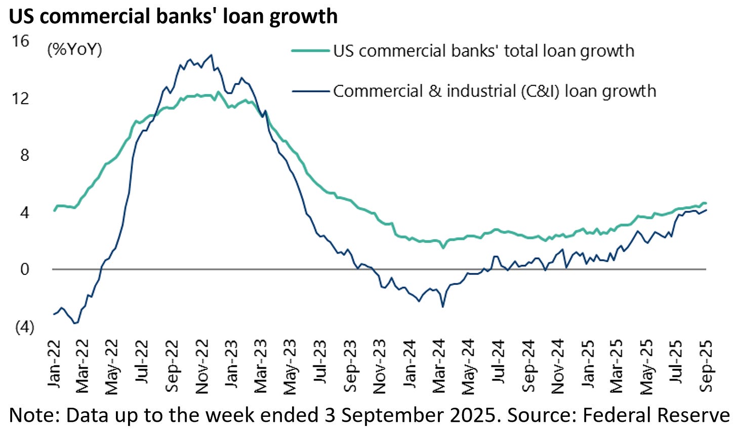 US commercial banks’ total loan growth has risen from 1.5% YoY in mid-March 2024 to 4.6% YoY in early September 2025, while commercial and industrial (C&I) loan growth is up from a negative 2.6% YoY to 4.1% YoY over the same period.