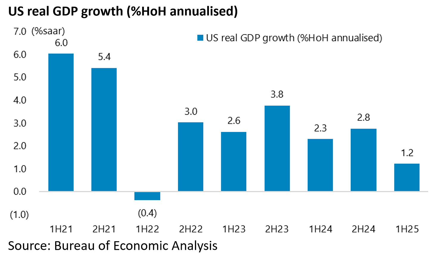 As regards the latest revised GDP data, stripping out the distortion triggered by the tariff agenda in terms of the front loading of imports in the first quarter, the key point is that the growth rate of the US economy has slowed from an annualised 2.8% in the second half of 2024 to an annualised 1.2% in the first half of this year.
