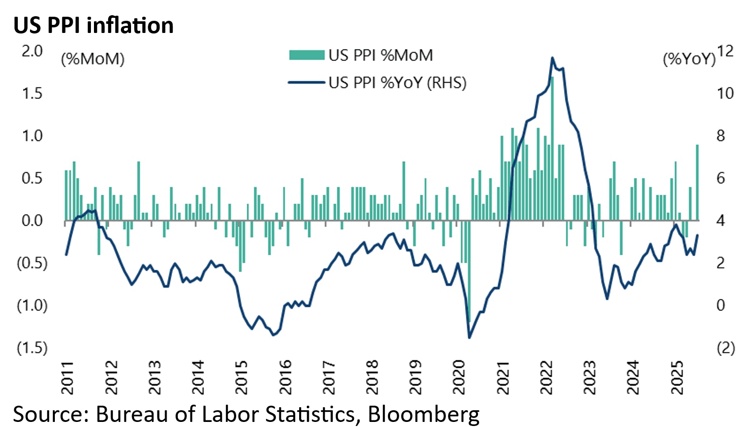 US PPI rose by 0.9% MoM and 3.3% YoY in July, compared with consensus estimates of 0.2% MoM and 2.5% YoY.