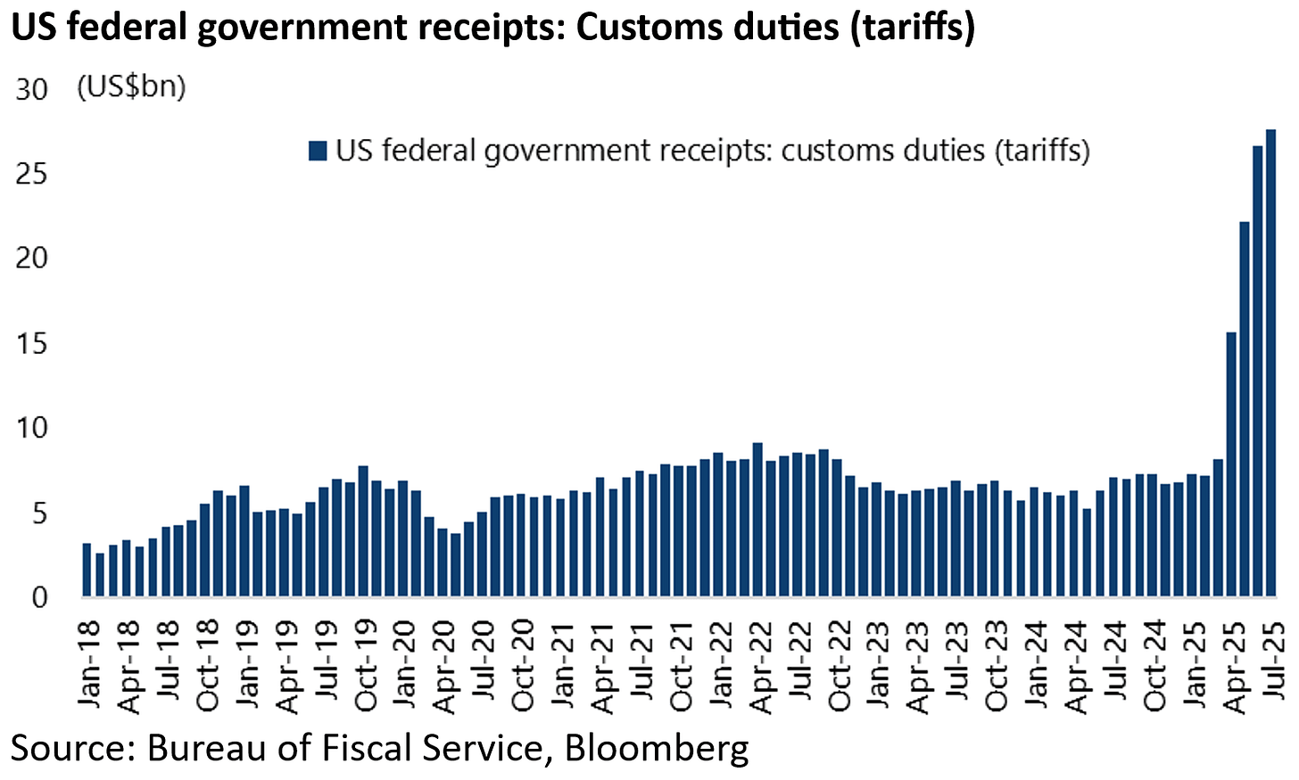 The monthly tariff-related federal government receipts have risen from US$7.2bn in February to a record US$27.7bn in July or an annualised rate of US$332bn.