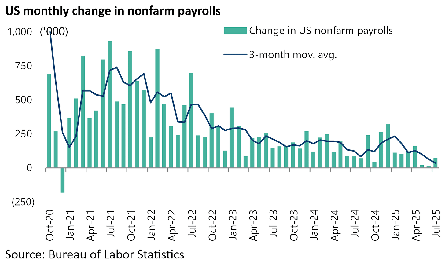 US nonfarm payrolls increased by only 73,000 in July, compared with consensus estimates of 105,000.