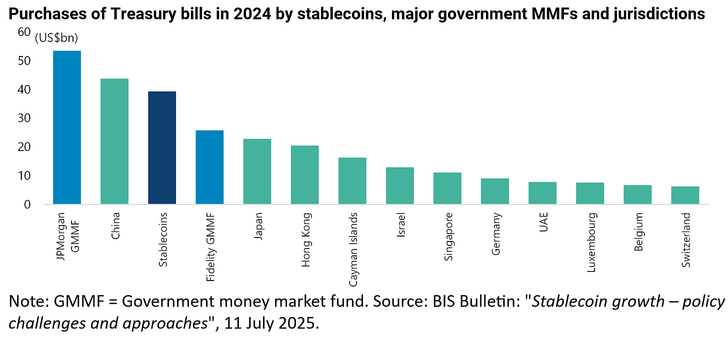 Meanwhile, it is also worth recording that the BIS estimated last month that stablecoins bought nearly US$40bn of Treasury bills in 2024, the third largest net buyer after JPMorgan Government Money Market Fund (US$53bn) and China (US$43.7bn) (See BIS Bulletin: "Stablecoin growth – policy challenges and approaches", 11 July 2025).