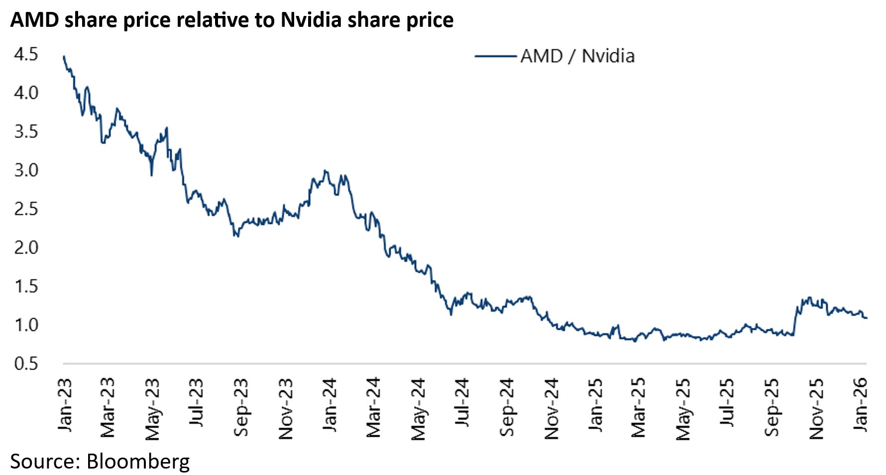 AMD has outperformed Nvidia by 27% since the beginning of last quarter but has still underperformed by 75% since the beginning of 2023.