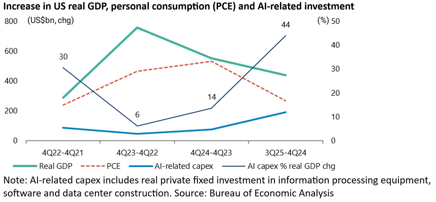 US real GDP rose by US$438bn or an annualised 2.5% in the first three quarters of 2025. While real personal consumption and real AI-related fixed investment, including private investment in information processing equipment, software and data center construction, increased by US$268bn and US$193bn respectively over the same period, or an annualised 2.2% and 19.8%.