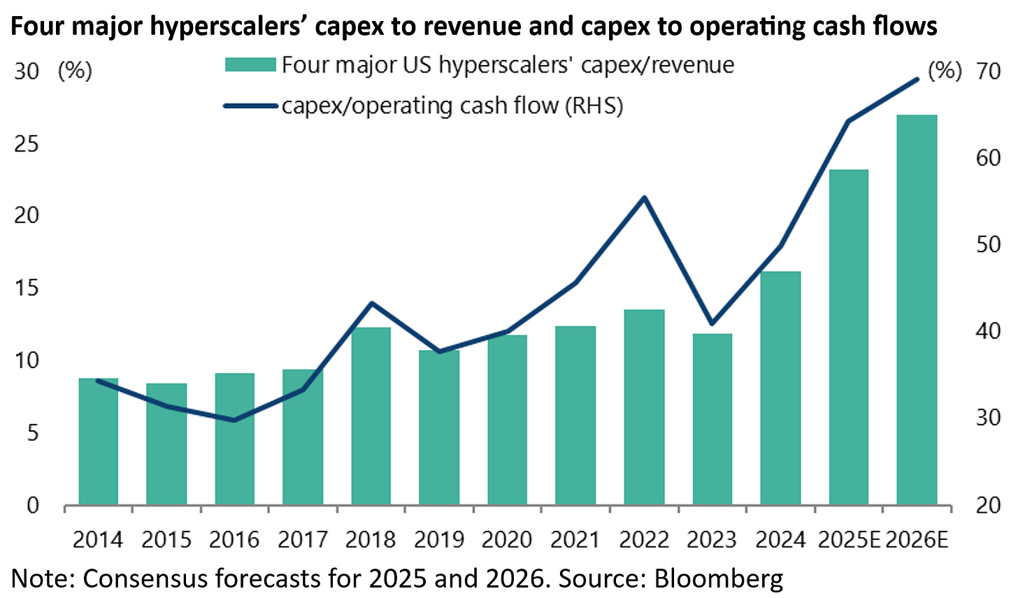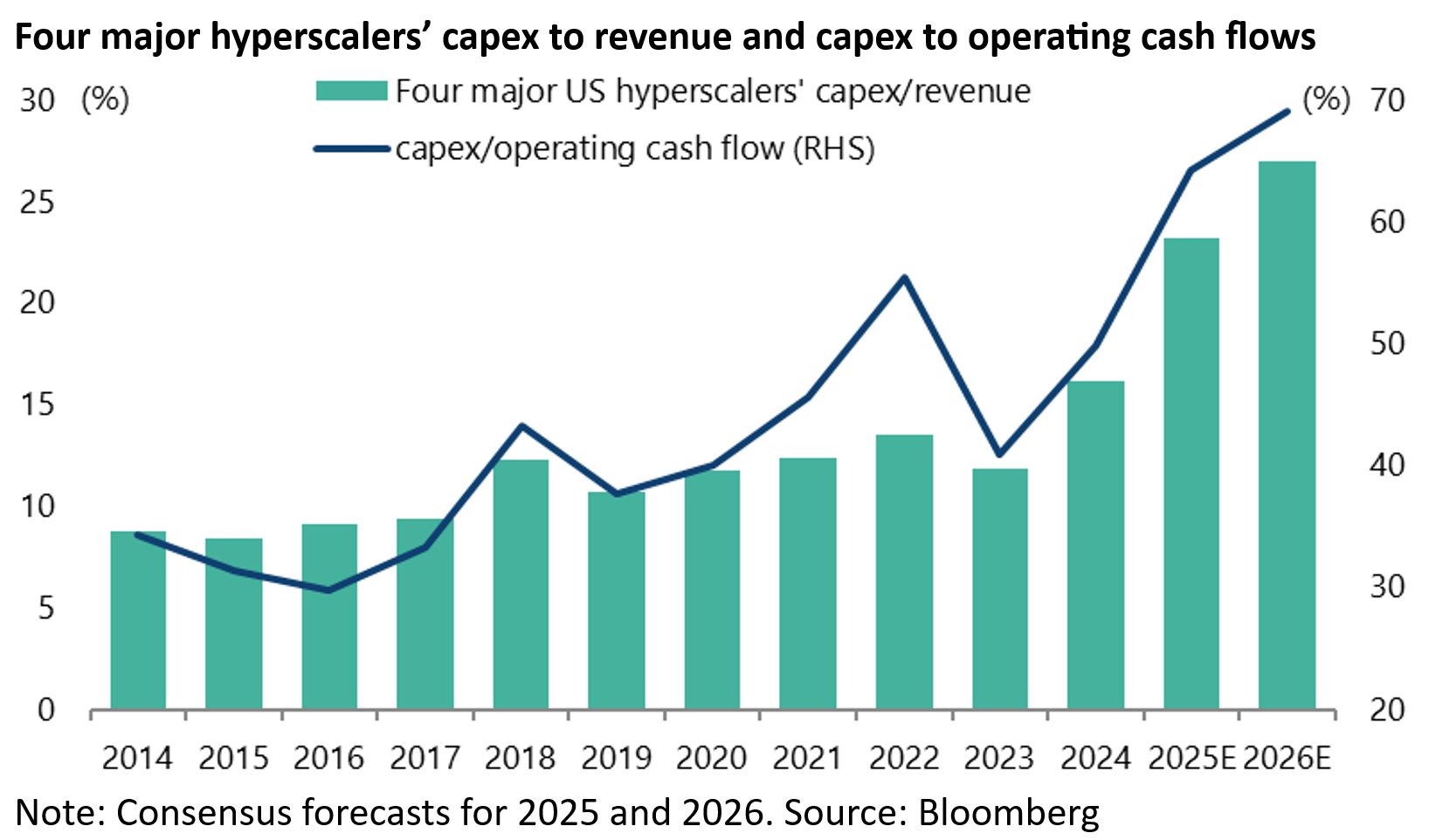 The four major hyperscalers’ capex to revenue ratio is projected at 23% in 2025 and 27% this year, or 64% of their combined operating cash flow in 2025 and 69% in 2026, based on consensus forecasts.