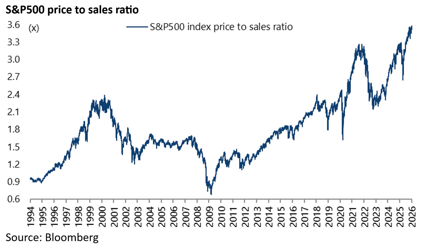 The S&P500 price to sales ratio has risen from a recent low of 2.65x in early April 2025 to a record high of 3.58x last Friday.