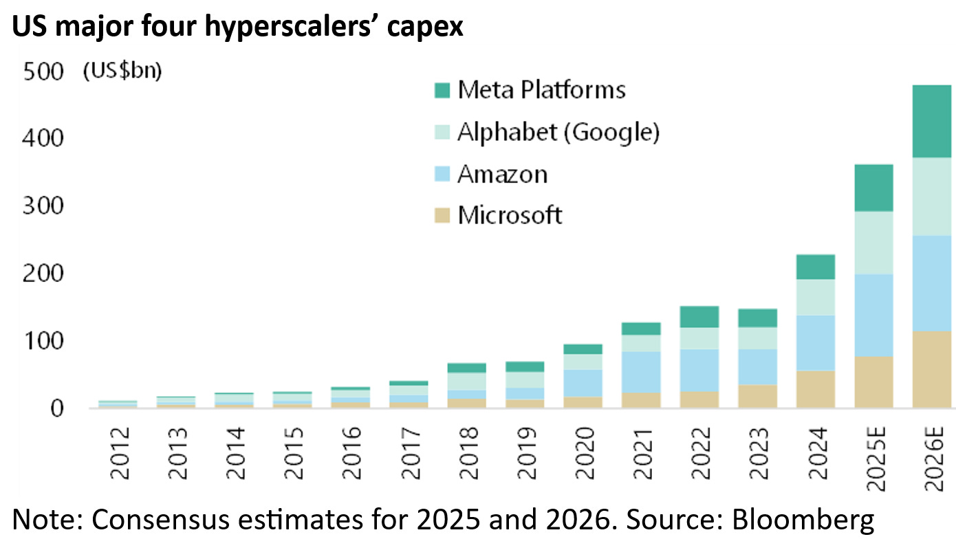 All that spending, running at an estimated US$360bn last year for the four major hyperscalers and a forecast US$480bn this year (see following chart), is based on the premise that OpenAI and others will be able to monetise so-called large language models (LLMs).